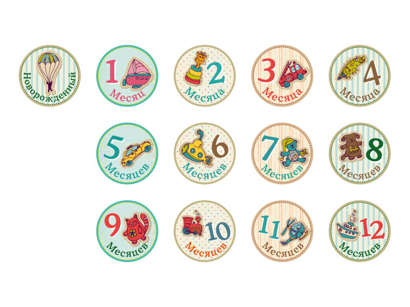 В наборе 13 оригинальных наклеек диаметром 10 см. на каждый месяц первого года крохи, начиная с рождения.