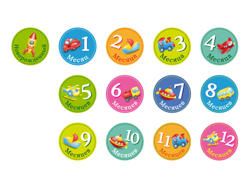 В наборе 13 оригинальных наклеек диаметром 10 см. на каждый месяц первого года крохи, начиная с рождения.
