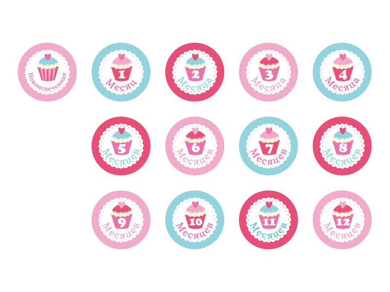 В наборе 13 оригинальных наклеек диаметром 10 см. на каждый месяц первого года крохи, начиная с рождения.
