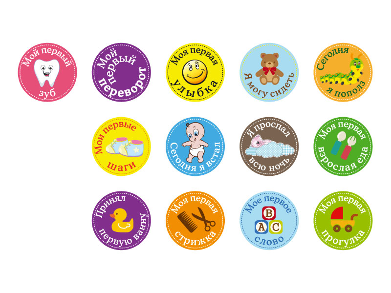 В наборе 13 оригинальных наклеек диаметром 10 см. на каждое достижение в жизни крохи.