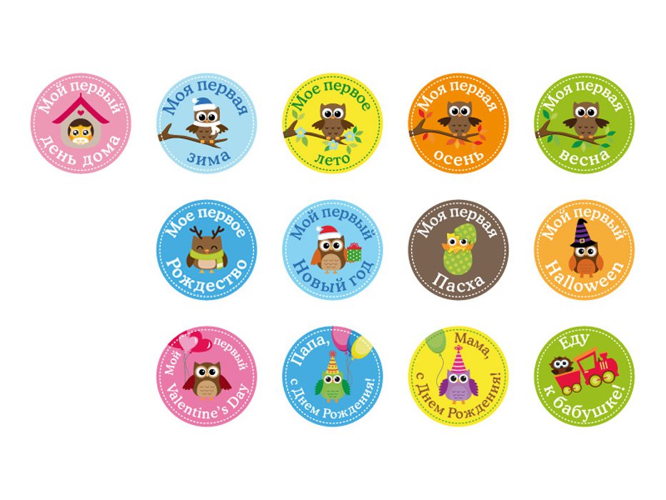 В наборе 13 оригинальных наклеек диаметром 10 см. на каждое первое событие в жизни крохи.