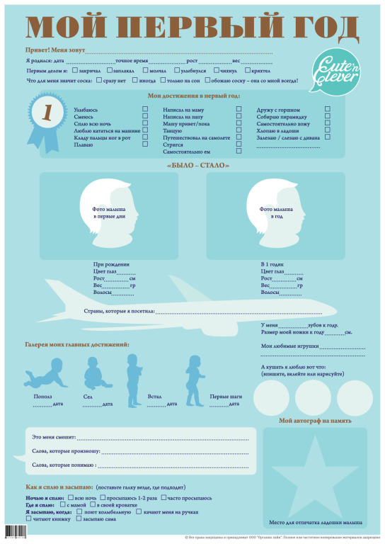 Маме с папой нужно просто отметить все достижения и победы своего малыша за весь первый год, вписать все его умения и изменения, вклеить фото при рождения и в годик. Этот плакат украсит Ваш праздник и наглядно расскажет гостям о самом важном из жизни малыша.