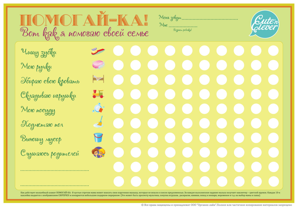 Именно для этого создан плакат "Помогай-КА!". В плакате перечесилены домашние обязанности, которые ребенок вполне может взять на себя. В пустые строки мама может вписать какие-то индивидуальные задачи. За каждое выполненное задание ребенок получает стикер. Каждый 10-й стикер призовой! Мама сама решает чем будет мотивировать своего кроху. Будь это просмотр мультика, совместных поход в зоопарк, совместная игра в дочки-матери, поход в гости, конфета, мороженое, да все что угодно. Главное, чтобы это было ценно для вашего малыша. В набор входит 1 плакат и 100 стикеров.