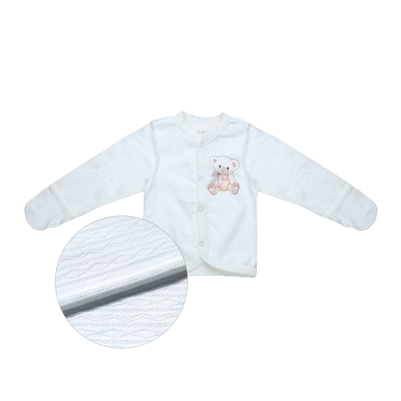 Детская кофточка из ажурного трикотажа обязательно придется по душе вашему малышу, в том числе и благодаря забавному мишке с розовым бантом, расположившемся на груди.
