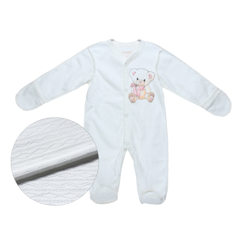 Легкий домашний комбинезон, для самых маленьких, выполнен из мягкого и дышащего хлопка - интерлок, с ажурным рисунком по всей поверхности полотна, и принтом в виде милого мишки.