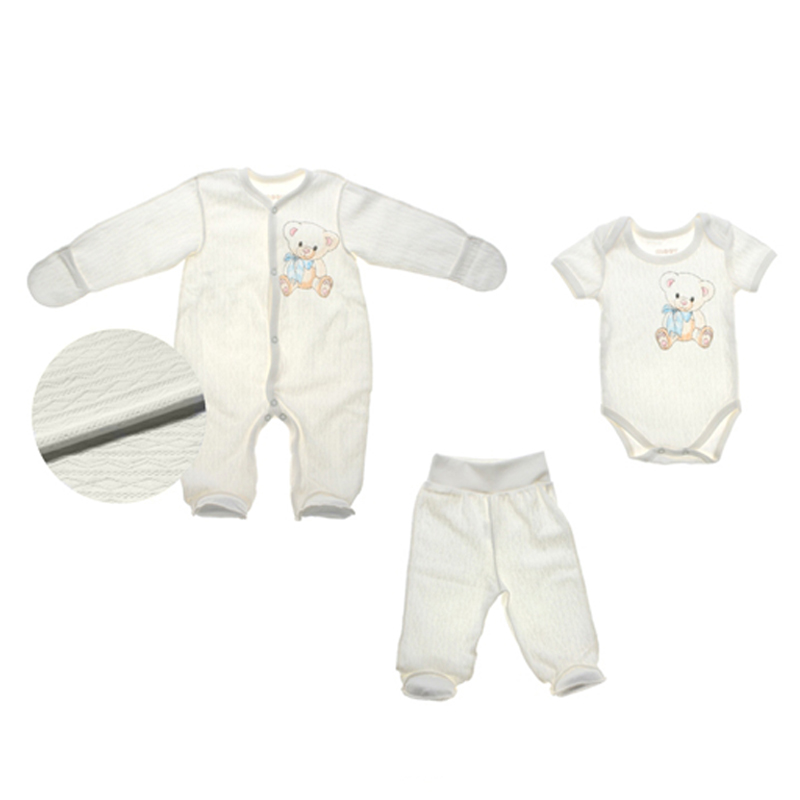 Боди и комбинезон украшают приветливые медвежата, которые обязательно понравятся крохе. А ползунки на мягкой резиночке, исключительно хорошо смотрятся как с боди из данного комплекта, так и с любой моделью коллекции <<Мишки Экрю>>.