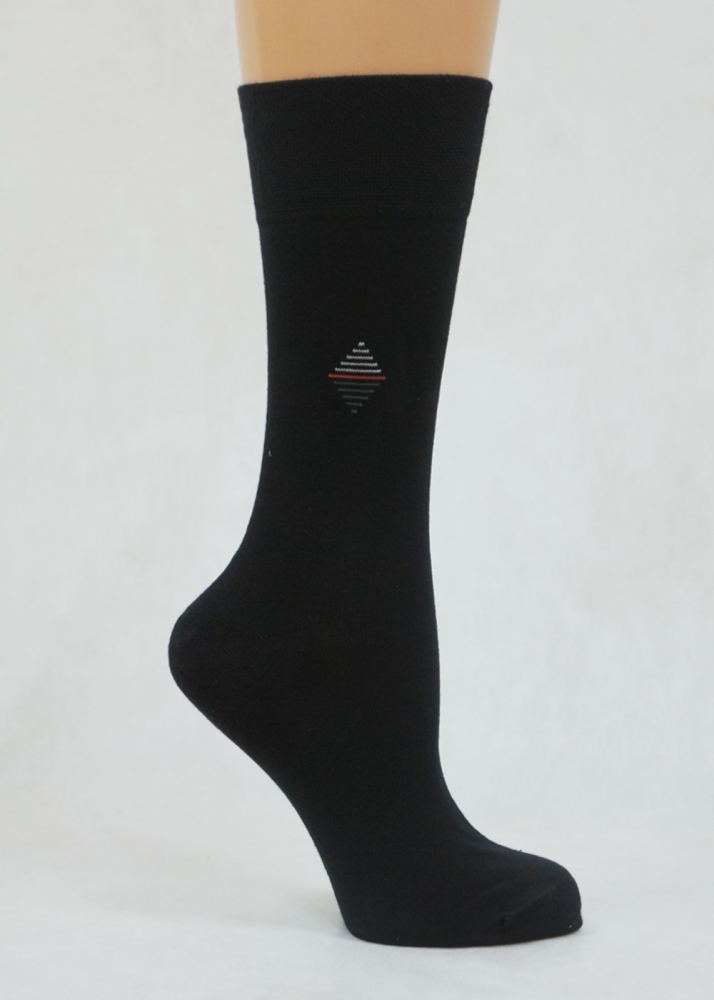 Однотонный носок с вывязанным двухцветным ромбом над щиколоткой, кетельный зашив мыска.