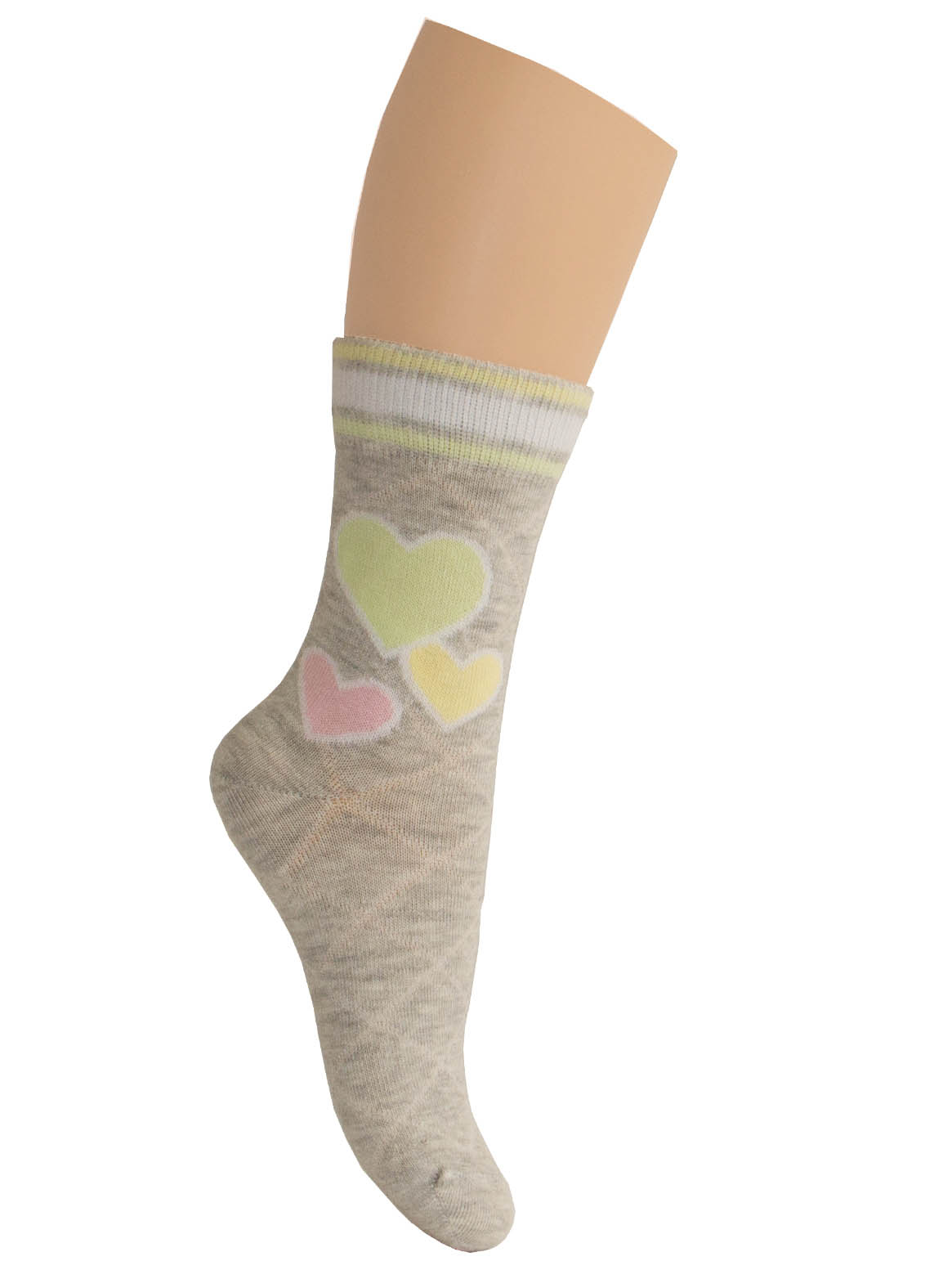 На паголенке вывязаны три цветных сердечка, по борту вывязаны цветные полосы