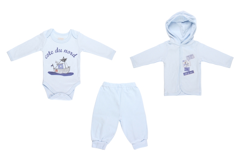 Описание:Комплект: кофта с капюшоном,штанишки,боди длинный рукав интерлок голубой