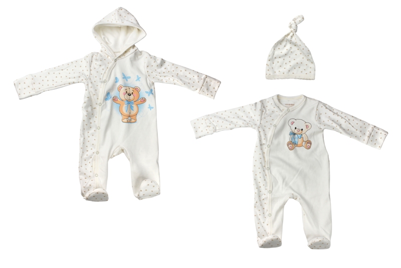 Комбинезоны этого набора не только красивы, но и необыкновенно удобны. Они имеют застежки в виде кнопок по всей длине сбоку, мягкие носочки и свободные манжеты.