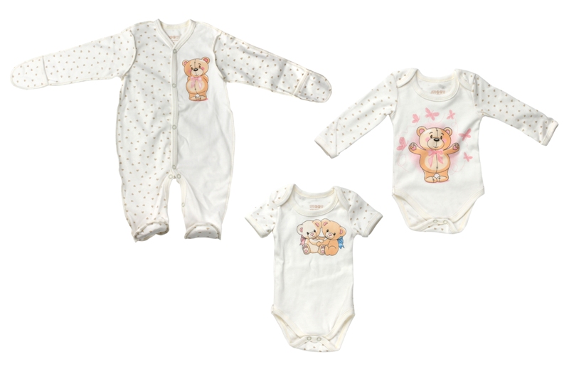 Комплект одежды для новорожденных, из трех предметов: двух боди - с короткими и длинными рукавами, и комбинезона.