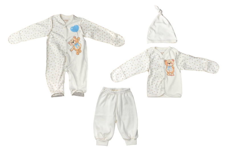 Замечательный комплект одежды для новорожденных состоит из комбинезона, штанишек, кофточки и шапочки.