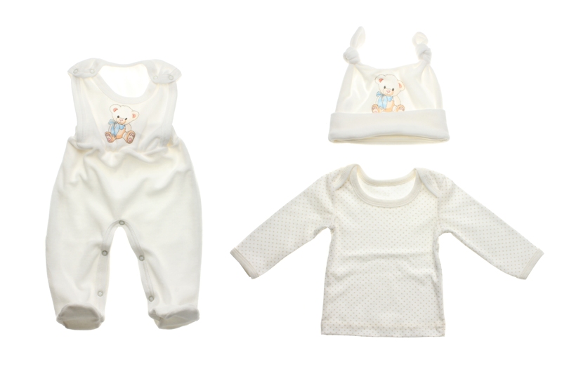 Готовый комплект одежды для новорожденных, включает в себя полукомбинезон и шапочку из велюра, а также трикотажную футболочку с длинными рукавами.