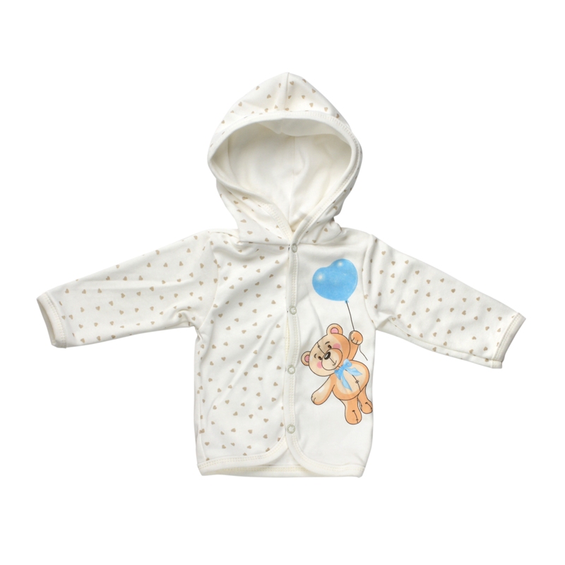 На груди красуется забавный медвежонок с голубым шариком и большим бантом, а капюшон декорирован симпатичными ушками, что делает изделие не только комфортным, но и необычайно милым