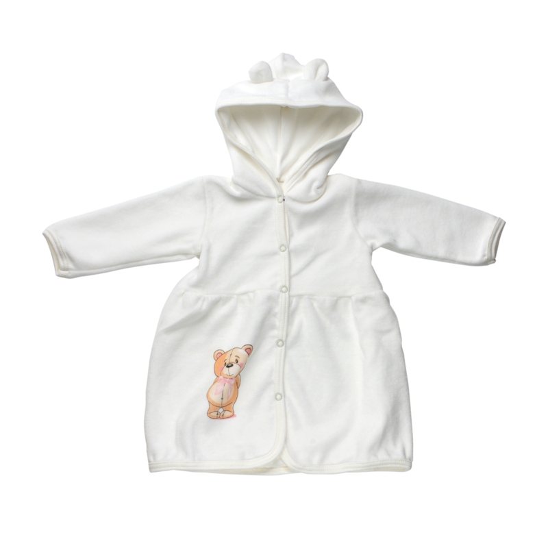 Практичное, и уютное за счет свободного кроя в виде халатика с кнопками спереди, а также длинных рукавов и капюшона с забавными ушками, платьице еще и необычайно нарядно, в том числе благодаря симпатичному плюшевому медведю с розовой ленточкой на шее.