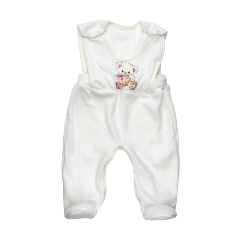 Велюровый полукомбинезон с мишкой на груди этой модели, настоящая находка для родителей. Его не придется полностью снимать, чтобы сменить подгузник или переодеть маечку из-за удачного расположения кнопочек на плечиках изделия и по всему периметру внутренней стороны штанишек. В пояс полукомбинезона дополнительно вшита эластичная резиночка для лучшей фиксации штанишек на талии ребенка.