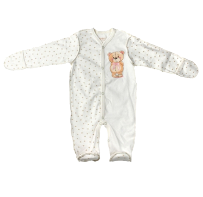 Легкий домашний комбинезон, для новорожденных, выполнен из мягкого и дышащего хлопка - интерлок, с дружелюбным медвежонком, который непременно придется по душе, как мамам так и малышам.