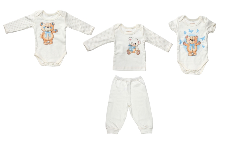 В комплект входят два вида боди с короткими и длинными рукавами и футболка с длинным рукавом.