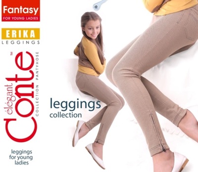 Легинсы для девочки из трикотажного полотна в косой рубчик с боковыми швами. По низу боковых швов разрезы с декоративными молниями. По переду изделия - имитация гульфика и боковых карманов. По спинке накладные карманы. Отделка контрастными нитками. Верхний срез легинсов обработан притачным поясом с резинкой внутри.