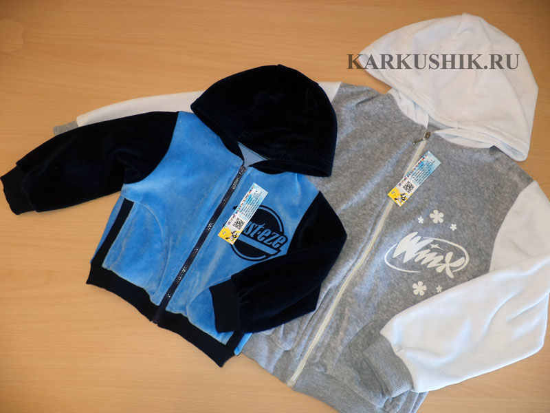 Курточка детская велюровая, с капюшоном, велюр отличного качества не сыпется, не деформируется при стирке. Манжеты и карманы отделаны плотным ластиком. Аппликация из флока на груди.Размеры 24 (74см.) - 38 (128 см.)