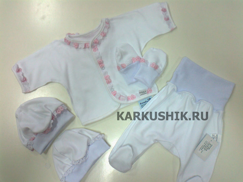 Комплект из плотного трикотажа для малышей состоит из 4 предметов: распашонка на кнопочках, ползунки на широкой резинке из мягкого ластика, шапочка - беретик, рукавички - нецарапки. Размер 18 (56см.) - 20 (62см.). Возможно на выписку из роддома.