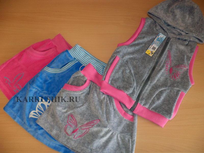 Комплект для девочек состоит из 2-х предметов: юбка с карманами и жилет с капюшоном, на молнии, трикотаж велюр. Размеры 24 (74 см.) - 34 (104 см.).