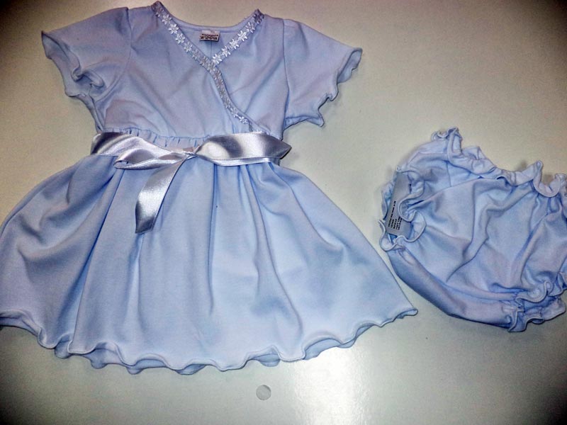 Платье из тонкого трикотажа - кулир (хлопок 100%), короткий рукав, отделано тонким цветочным кружевом. Белое платье часто применяют на крещение ребенка. Вместе с платьем идут трусики под памперс из тонкого трикотажа.