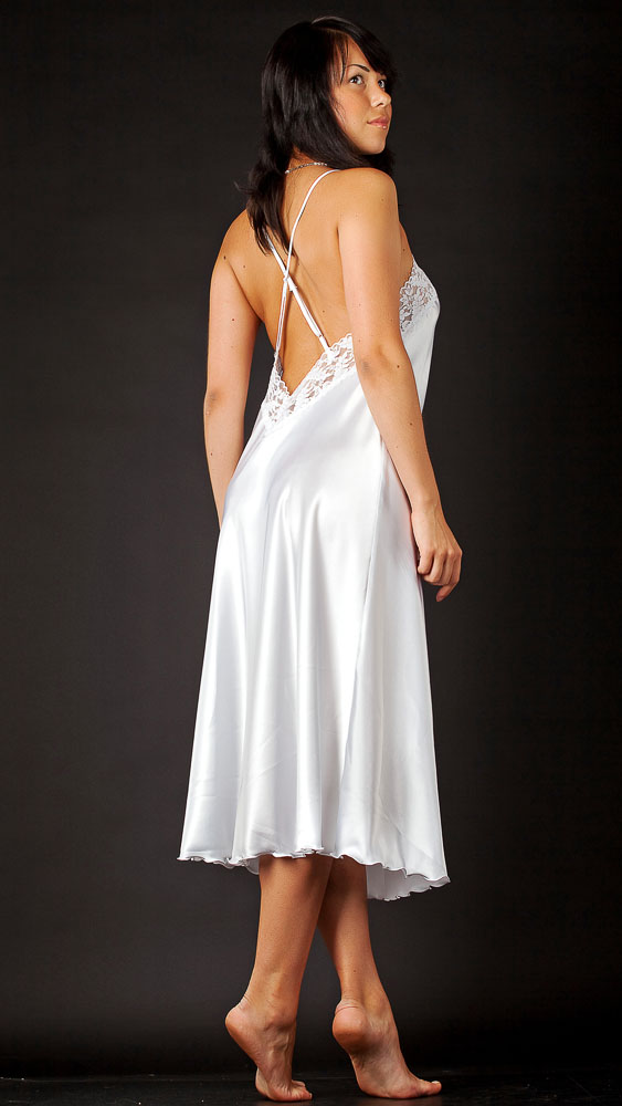 Сорочка атласная длинная, приталенного силуэта, расклешенная к низу. Узкие перекрещенные бретели регулируются на спине. Широкое кружево украшает пройму и глубоко вырезанную спинку. Изделие покроено по косой, что способствует удобству и лучшему облеганию фигуры.