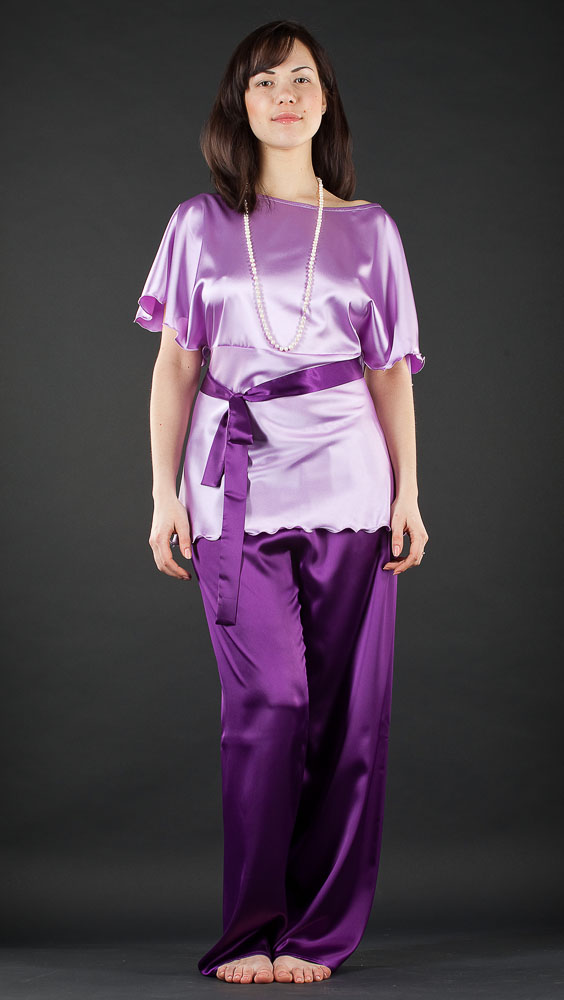 Домашний комплект, состоящий из широкой туники и брюк. Горловина-лодочка и спущенный рукав-крылышко туники эффектно подчеркивает линию плеч. Длинный пояс в тон брюкам.
