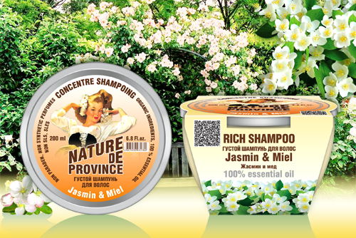 Шампунь <<Жасмин и мед>> великолепно очищает волосы, питая, но не утяжеляя их. Содержит восстанавливающий природный биокомплекс (главные компоненты эфирное масло жасмина и органический экстракт меда (ECOCERT), мгновенно делающий волосы блестящими, мягкими и эластичными.