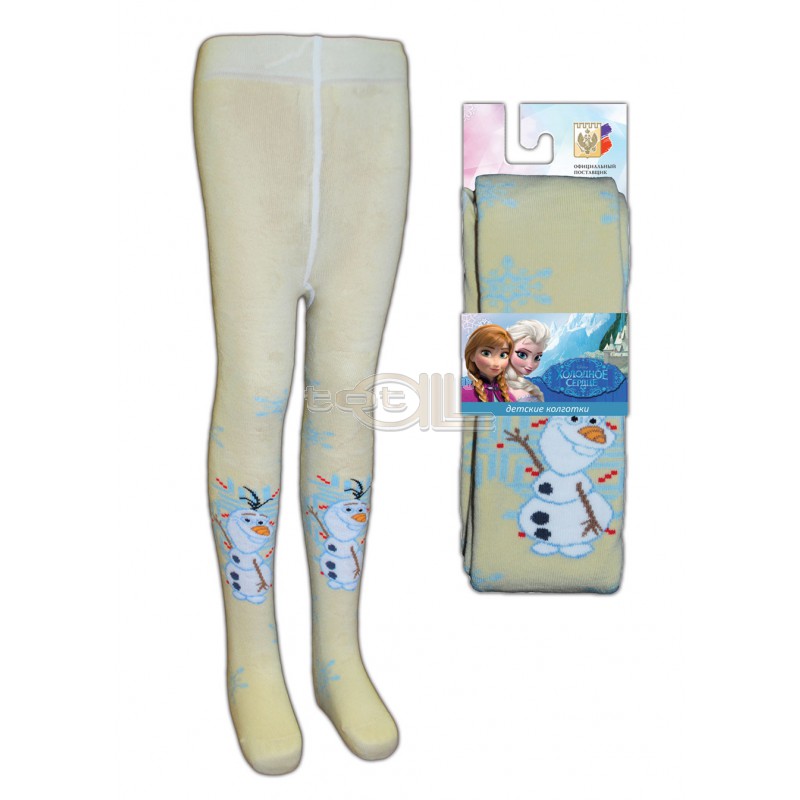 Колготки детские, плюшевого переплетения. По всему изделию вывязаны снежинки, на рисунке изображен Снеговик.