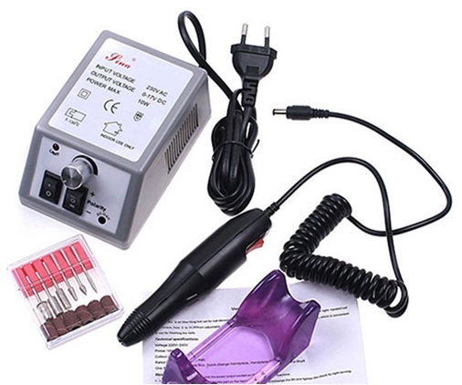 Комплектация: Блок питания, ручка-микродвигатель, набор алмазных и одноразовых фрез (6 насадок с алмазным напылением для обработки края ногтя, шлифовки, тонкой шлифовки, удаления кутикулы, удаления мозолей и огрубевшей кожи, чистки под ногтями, коррекции искусственных ногтей и финишной шлифовки), подставка для ручки.