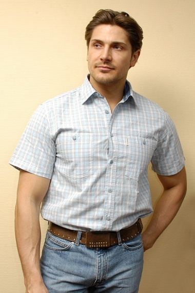 Привлекательная своим светлым, голубовато-сиреневым оттенком легкой хлопковой ткани мужская рубашка данной модели имеет свободный силуэт. Неординарная, синего цвета внутренняя часть стойки воротника придает стильность и оттеняет светлый тон рубашки. Рукава короткие, что позволяет комфортно чувствовать себя в помещении и на улице в летние жаркие дни. Нагрудные карманы с пуговицами светло-голубого цвета в тон ткани дополняют оригинальность модели. Она будет безупречно смотреться с легкими летними брюками и голубыми джинсами как на отдыхе, так и на работе в офисе.